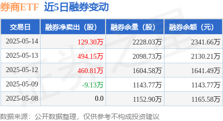 券商ETF:5月14日融券净卖出129.3万股,连续3日累计净卖出1084.26万股
